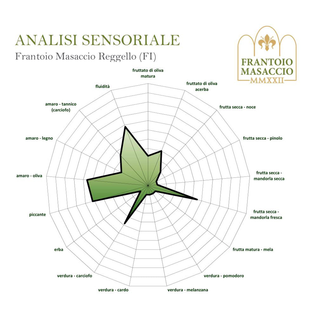 Profilo sensoriale: Al naso sprigiona un aroma intenso ma raffinato, con note di oliva al giusto grado di maturazione. Al palato è delicato e armonico, con richiami di mandorla fresca, mela e carciofo, accompagnati da un amaro e un piccante ben calibrati, mai invasivi.